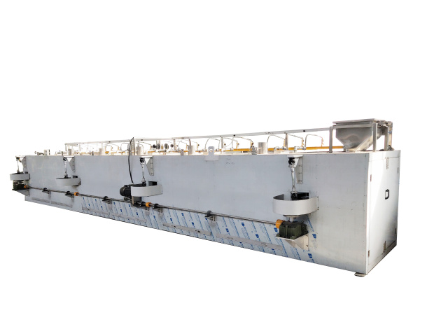 全自動平面回轉(zhuǎn)烤爐主要用于堅果炒貨及籽類產(chǎn)品裹衣裹粉后的烘烤加工。采用直燃式加熱方式,熱量直接作用于食品上,烘烤香味更濃郁,并通過設備的搖擺避免食品粘連變形。具有烘烤口味色澤優(yōu)良, 沒有污染等特點。